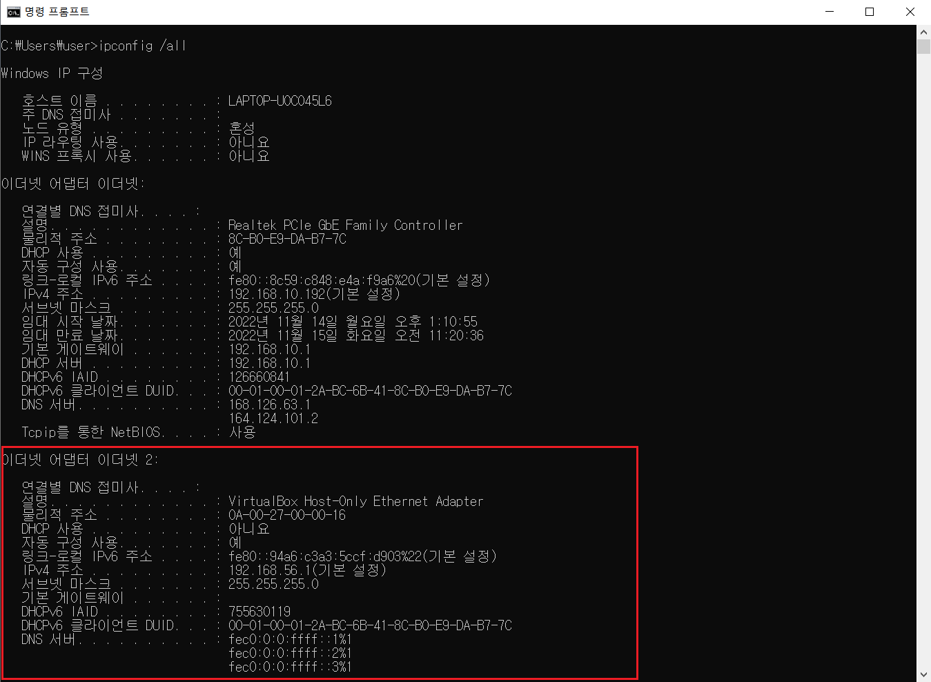 CMD > ipconfig /all 명령어를 통해 할당된 네트워크 확인