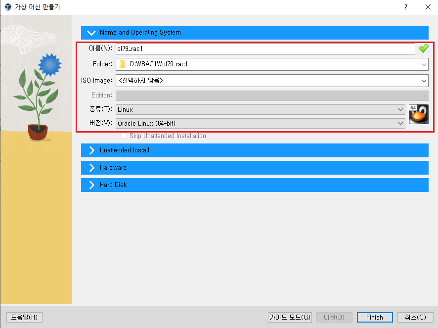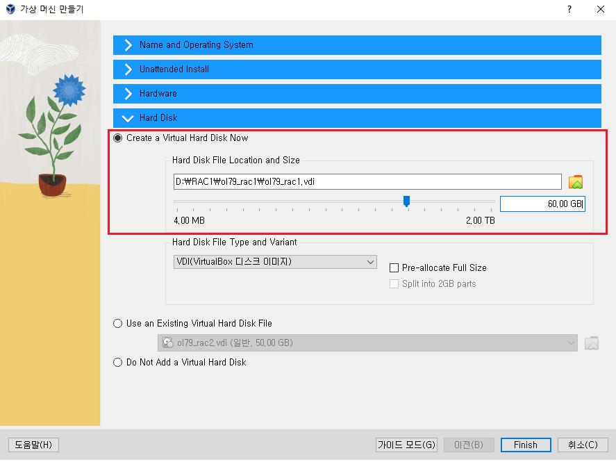 - OS 구축 후 추가로 가상 하드 디스크 생성 예정